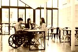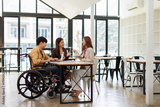 Asian Male Manager On A Wheelchair Sitting With His Colleagues At Workplace