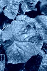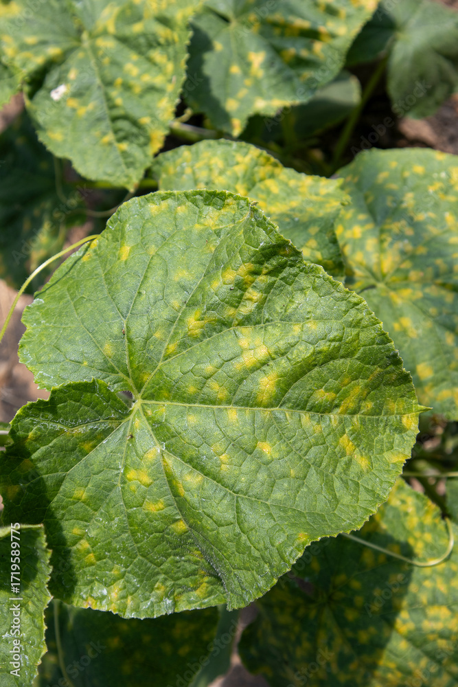 Cucumber leaf showing downy mildew disease symptoms with yellow spots, indicating plant health problem in agriculture