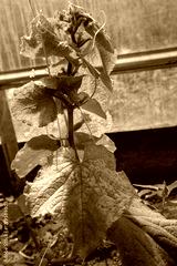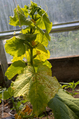 Cucumber plant growing in a greenhouse showing disease, yellowed leaves, and signs of nutrient deficiency or illness