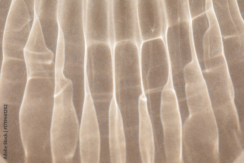 Abstract shadows golden background from pouring sunlight from glass top view. Natural caustic background from light glare and shine reflection effects for product presentation.
