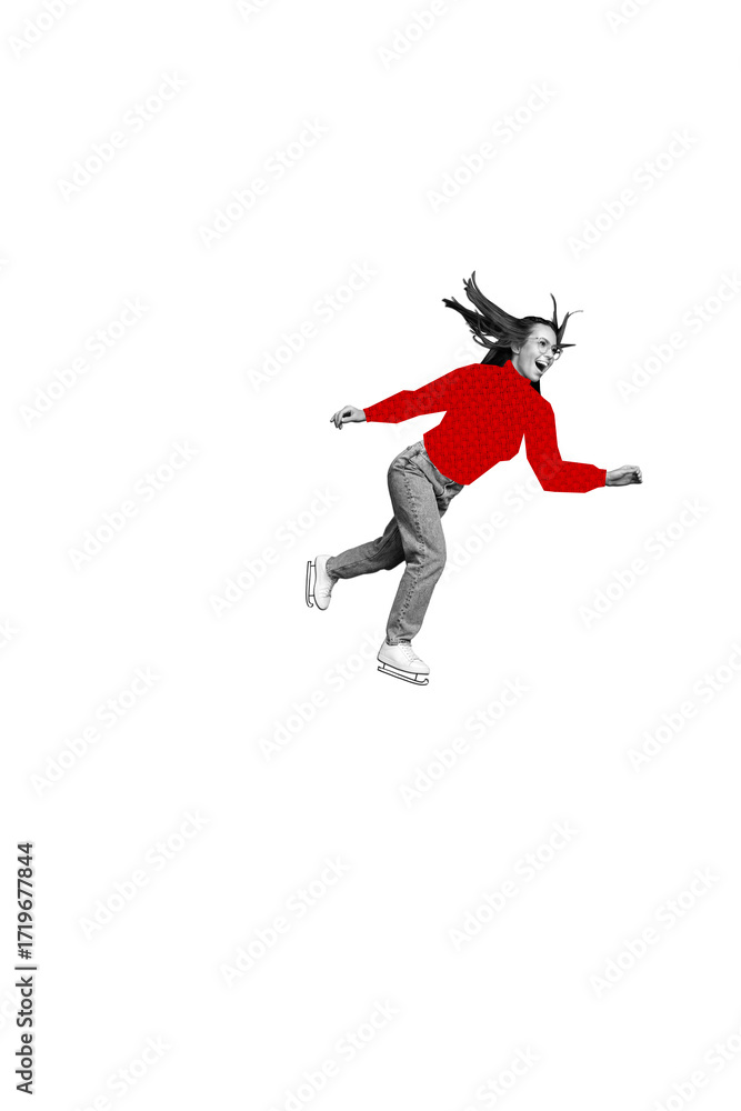Sketch composite collage of winter season advent Christmas holiday happy young woman fast ride ice skates frozen water nature relax smile