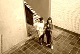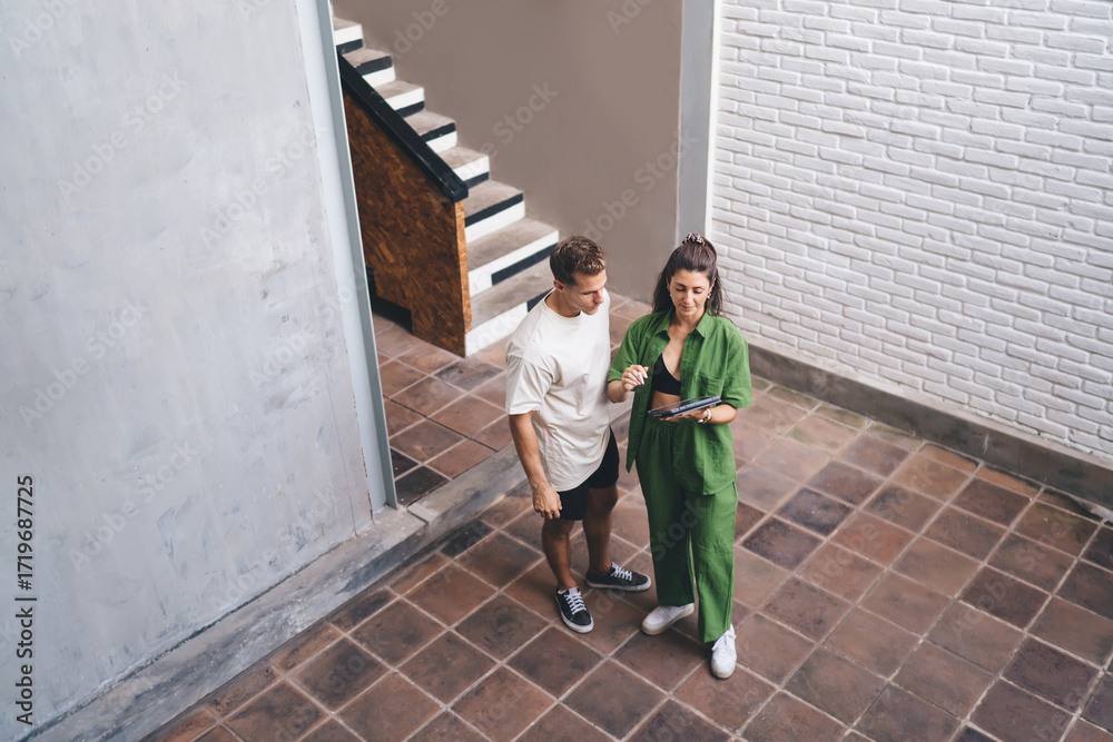 Top-down view of young couple standing and planning on tablet, expressing minimalistic collaboration, smart technology use, and intuitive teamwork in spacious setting.