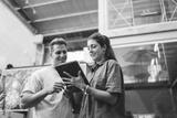 Woman using stylus to interact with tablet while man engages in discussion, capturing real-time collaboration, digital strategy, and tech-powered brainstorming in relaxed setting.