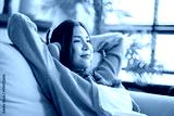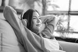 Happy young asian woman use headphones and relaxing at home.Female smile sitting on sofa,couch and holding mobile smartphone.Listening to music on lazy and radiating joy and relaxation.