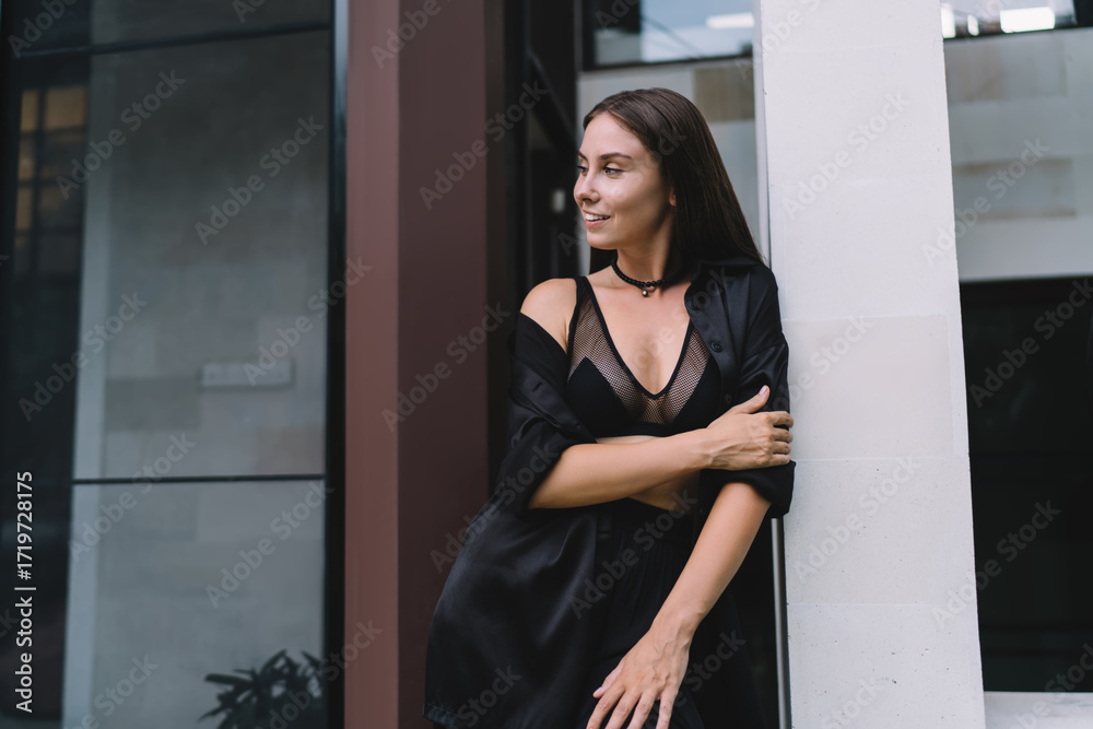 Attractive young woman smiling confidently near minimalist villa, wearing sheer black top and relaxed pants, radiating energy of calm success and self-assurance.