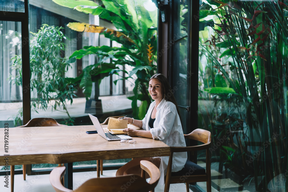Laughing remote worker sits at laptop in sunny workspace, celebrating freedom, joy and career flexibility through modern digital entrepreneurship.