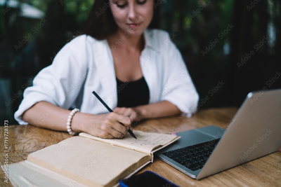 Close-up of woman writing in journal beside laptop, capturing moment of mindful planning and blending digital tools with analog creativity in freelance lifestyle.