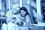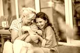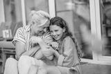 Grandmother and granddaughter spending summer together, sitting in front of house.