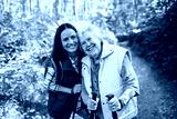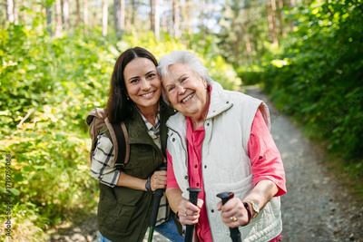 Senior woman and daughter enjoying hike with trekking poles.