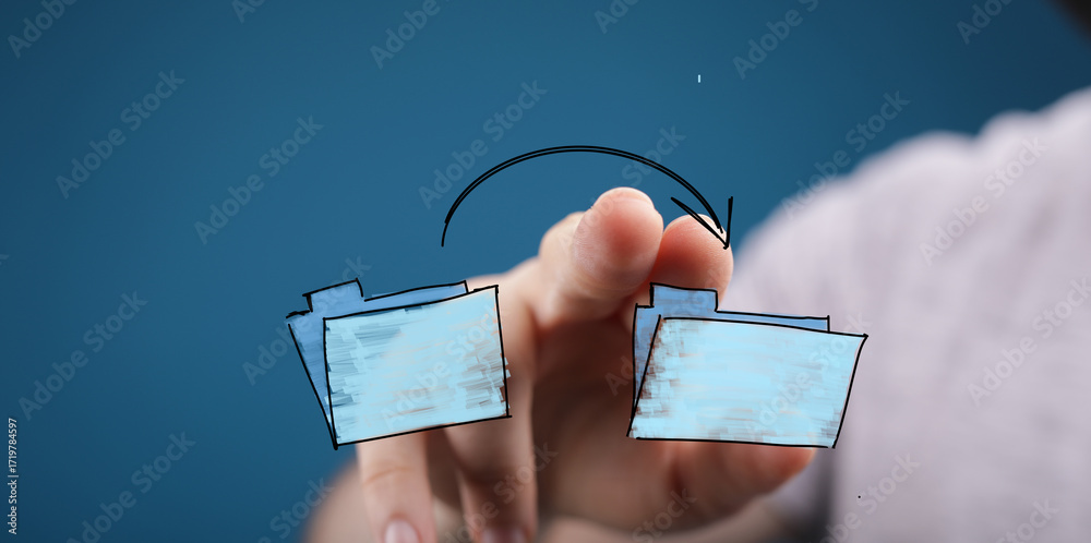 Hand gestures interacting with digital files, symbolizing data transfer, online sharing, and document management.
