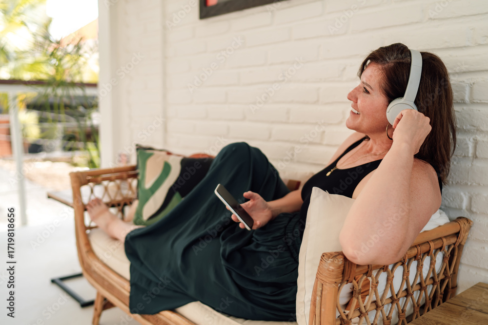 Hispanic woman uses VR headset, exploring immersive technology and virtual environments in a futuristic digital landscape.