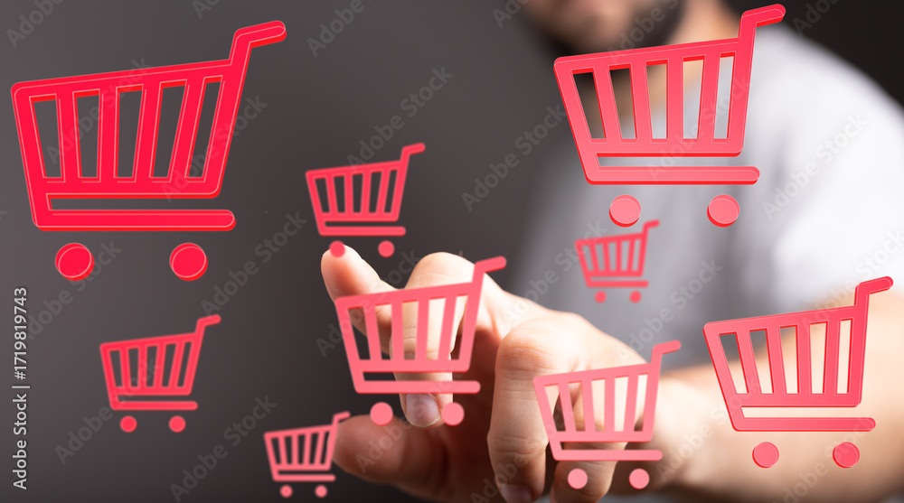 Person interacts with digital shopping carts, symbolizing online shopping and e-commerce.