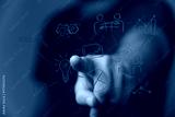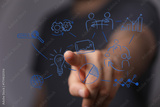 Hand pointing at digital business strategy, innovation, teamwork, and growth icons. Ideal for presentations, reports, and marketing.