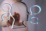 Abstract image of a person interacting with digital communication bubbles, symbolizing ideas, communication, and digital interaction.