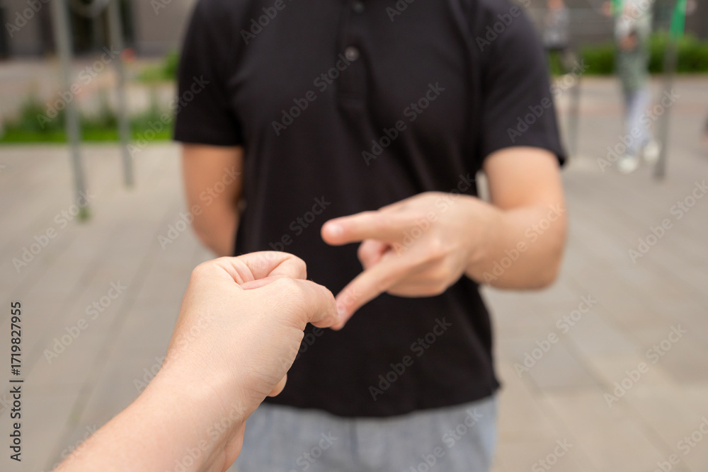 Two people engaging in a hand game rock paper scissors outdoors in a city setting during the day