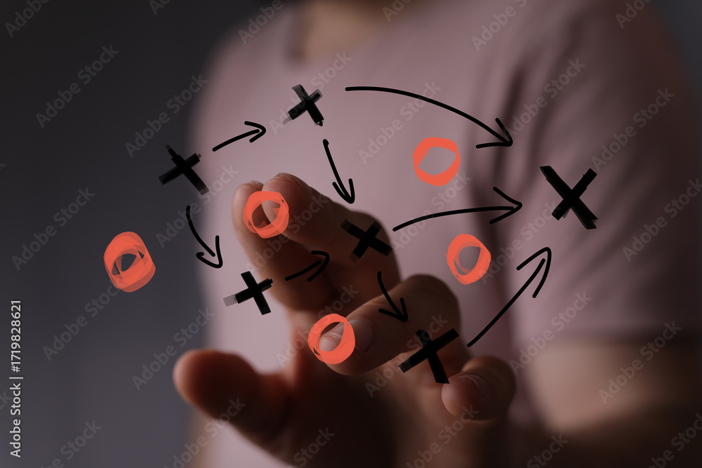 Hand interacting with a strategic planning diagram. Success, growth, solution, business concept.