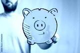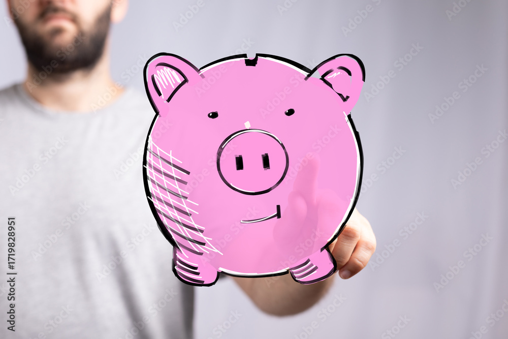 Digital piggy bank graphic held by a man, illustrating savings, finance, and money management.