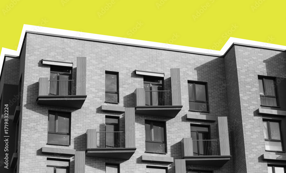 Black and white architectural facade with brick walls, balconies, and vertical details, contrasted