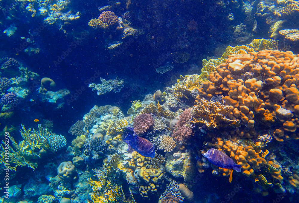 Coral reef in sea. Underwater marine habitat with tropical fish, exotic lagoon, biodiversity,