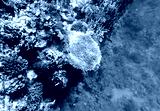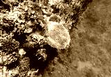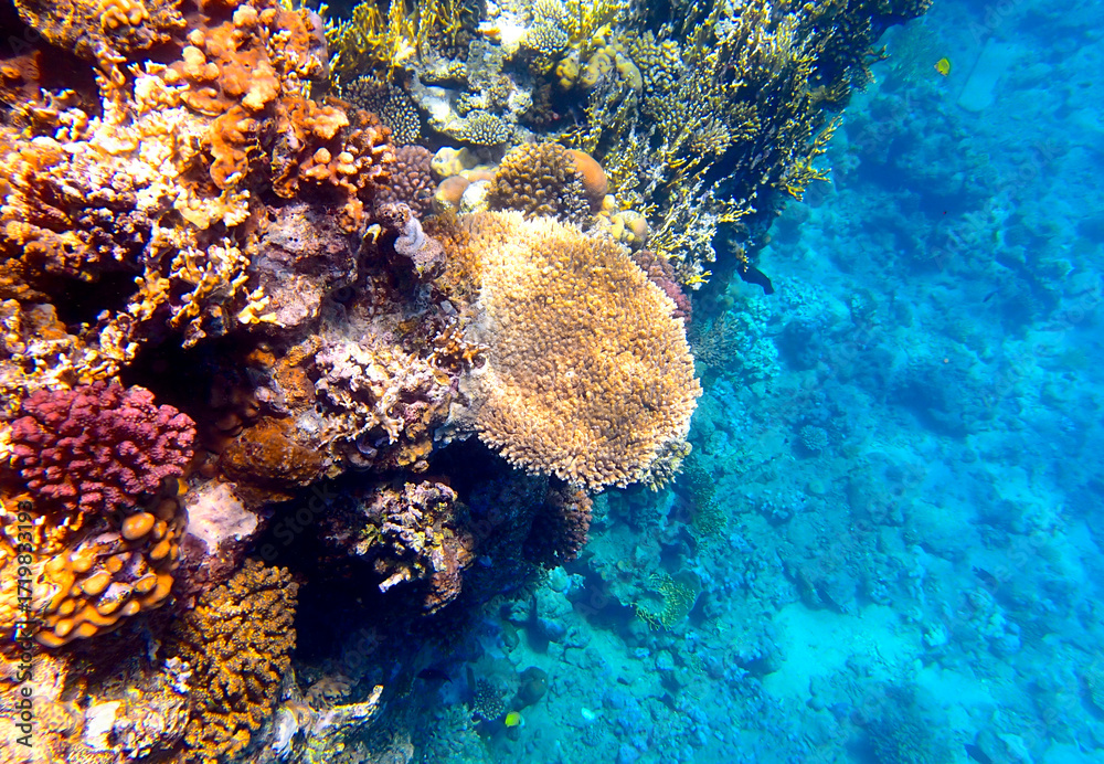 Coral reef underwater. Acropora table coral surrounded by red pocillopora and orange millepora