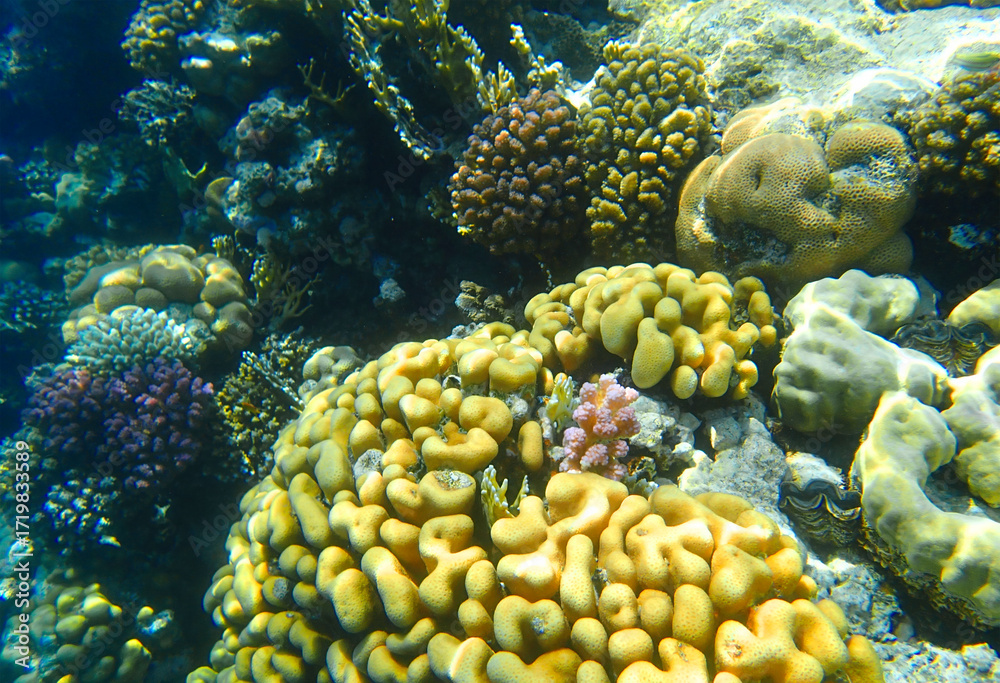 Coral reef underwater. Golden porites with brown pocillopora and purple colonies near platygyra and