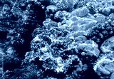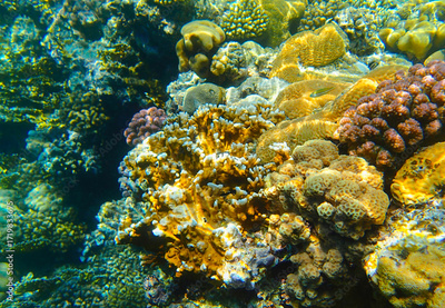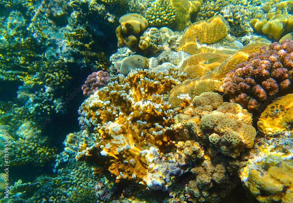 Coral reef underwater. Golden porites with purple pocillopora and platygyra among acropora and