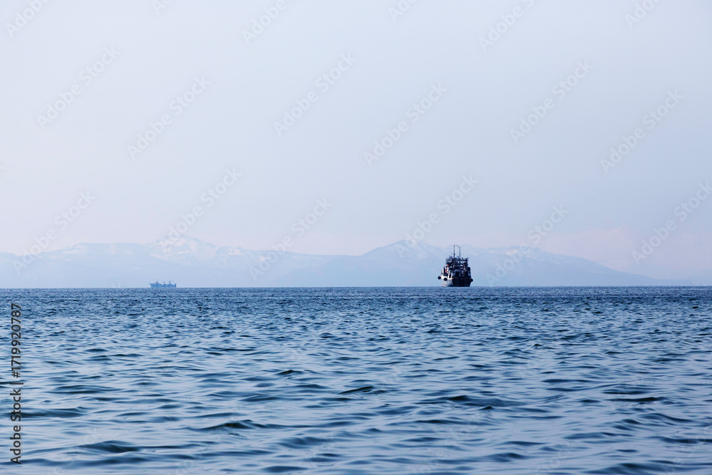ship in Avacha bay in blue spring evening twilight