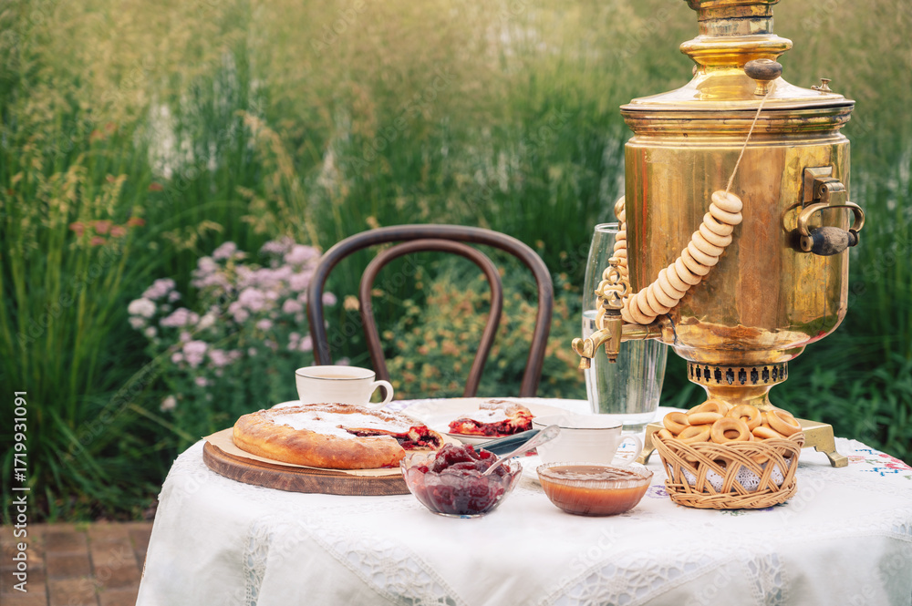 A golden samovar with bagels, tea cups, homemade pie, and jam on a white tablecloth set for tea in a garden.