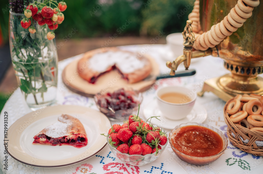 A rustic tea setting with golden samovar, fresh strawberries, jam, pie, and bagels arranged on an embroidered tablecloth outdoors.
