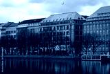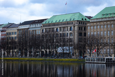 Esquina de una calle con edificios históricos de color verde menta. Escena urbana europea, perfecta para fondos de ciudades, viajes y arquitectura clásica.