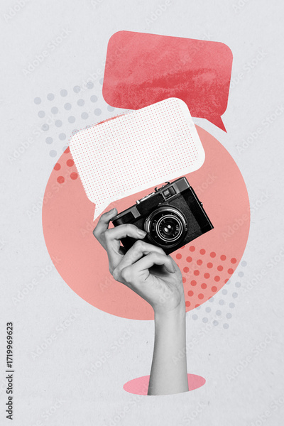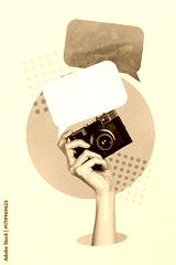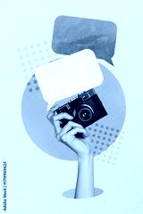 Trend artwork banner sketch 3D photo collage of text cloud balloon quote comment hand hold camera shooting hobby discussion feedback