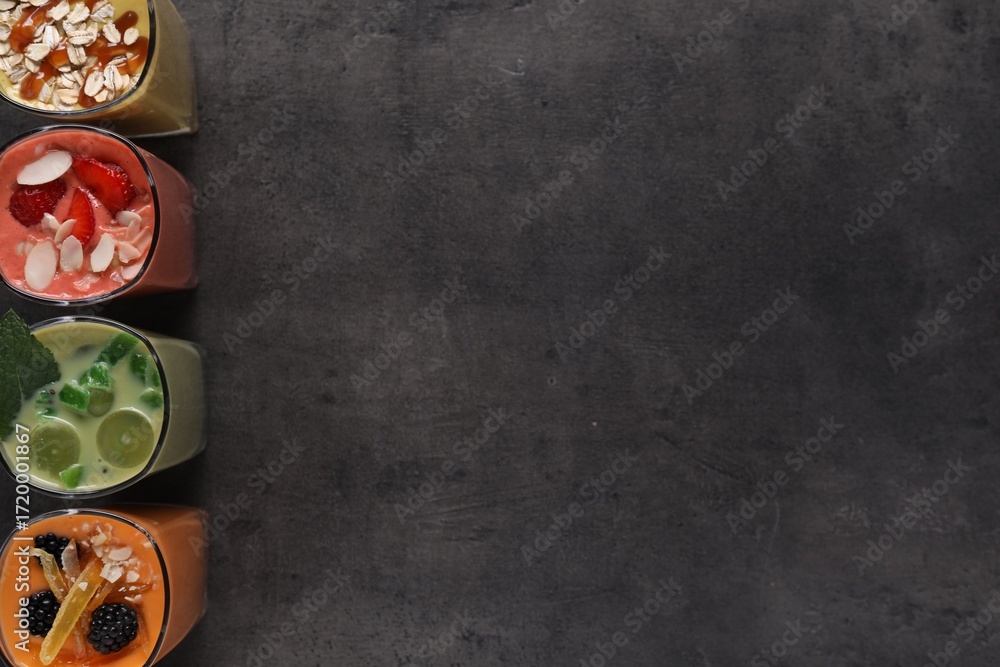 Many different delicious smoothies on grey table, flat lay. Space for text