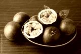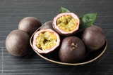 Fresh passion fruits with green leaves on black wooden table, closeup