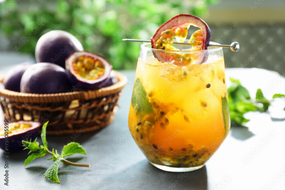 Tasty passion fruit drink in glass, fresh fruits and mint on gray table, closeup