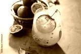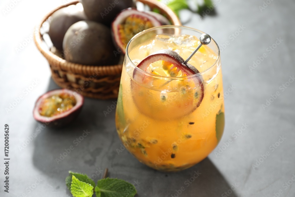 Tasty passion fruit drink in glass, fresh fruits and mint on gray table, closeup