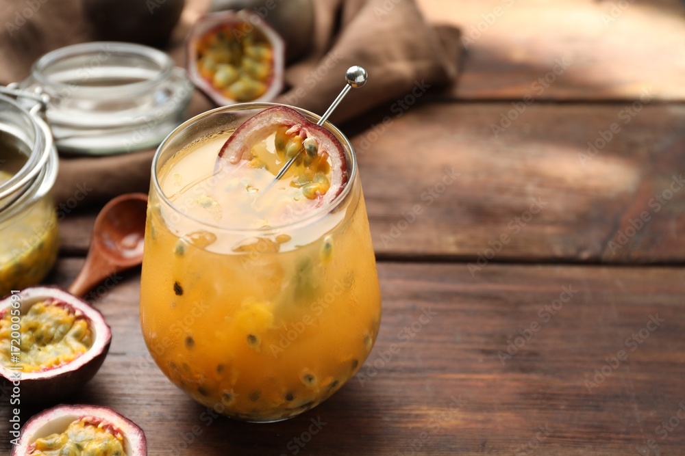 Tasty passion fruit drink in glass and fresh fruits on wooden table, closeup. Space for text