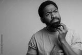 Thinking black man close up holding chin isolated on background