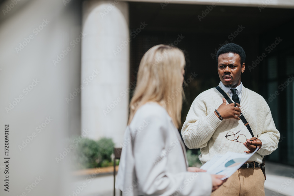 Two professionals engage in discussion outside a contemporary office building, fostering collaboration.