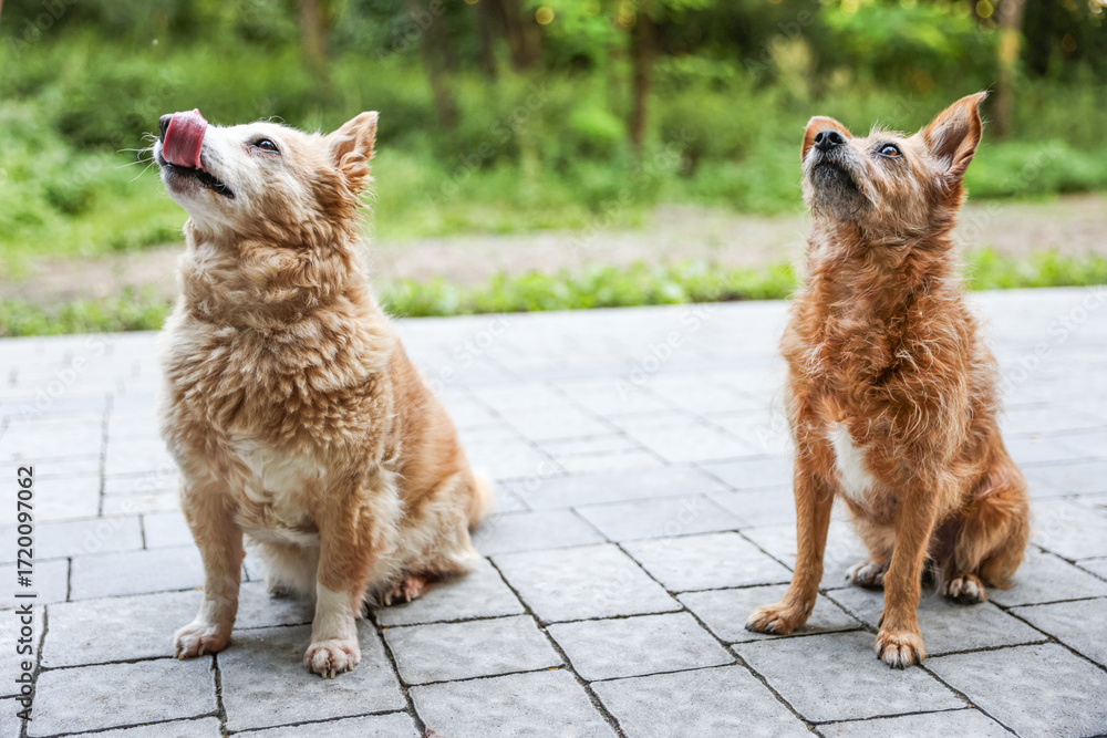Cute stray dogs on pavement outdoors. Homeless animal
