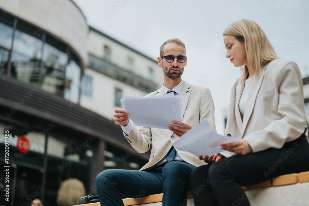 Two business people review documents together outdoors, showcasing collaboration and teamwork in a modern urban area, emphasizing professionalism and focused communication in a business context.