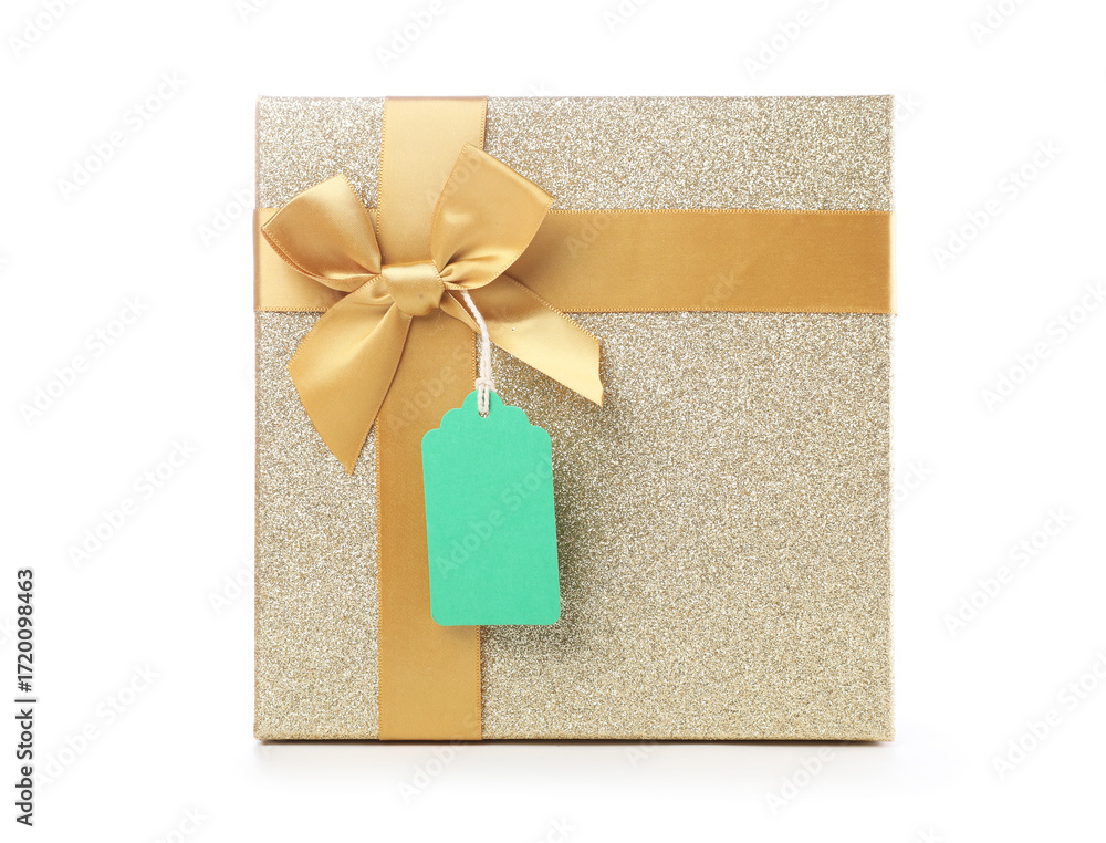 Gift box with blank tag isolated on white