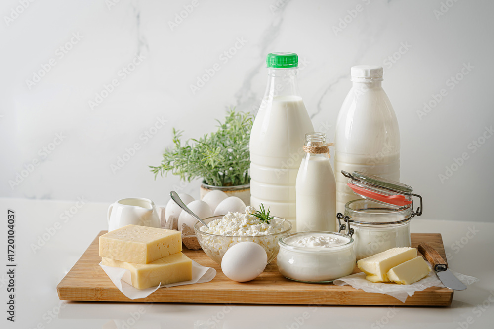 Fresh dairy products, milk, cottage cheese, eggs, yogurt, sour cream and butter on kitchen table