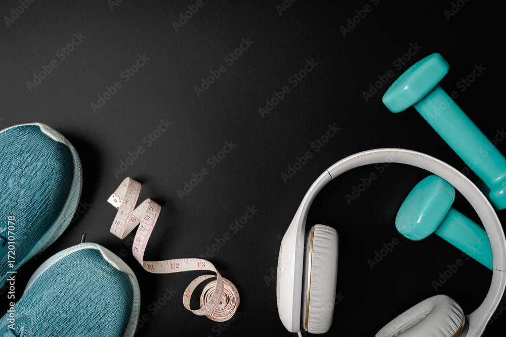 Workout flat-lay with sneakers, dumbbell, and headphones on black background top view. Sport and fitness concept