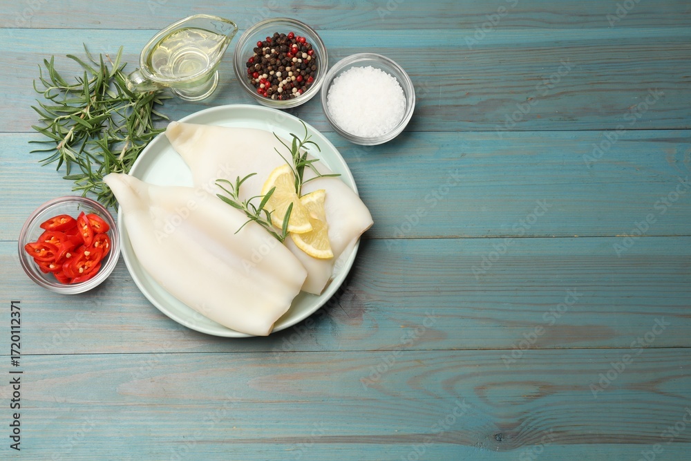 Uncooked squids with lemon slices, rosemary and spices on blue wooden table, flat lay. Space for text