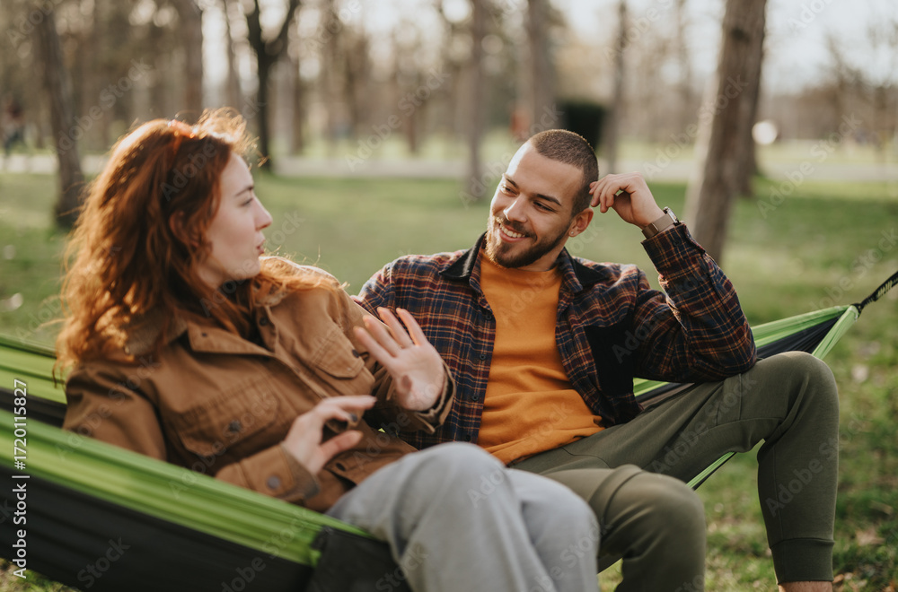 A cheerful couple engaging in conversation while relaxing in a hammock in a park setting. The outdoor environment and the lively expressions convey a sense of warmth, friendship, and connection.