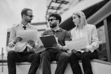 A group of three professionals reviewing paperwork and charts, collaborating on work projects outside.
