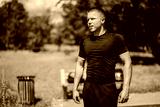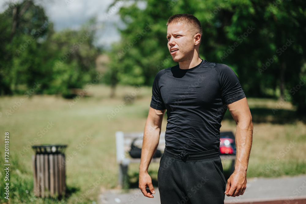 A fit young man in sports attire, standing outdoors in a park on a sunny day. The setting conveys fitness, healthy lifestyle, and outdoor sports activities surrounded by nature.