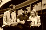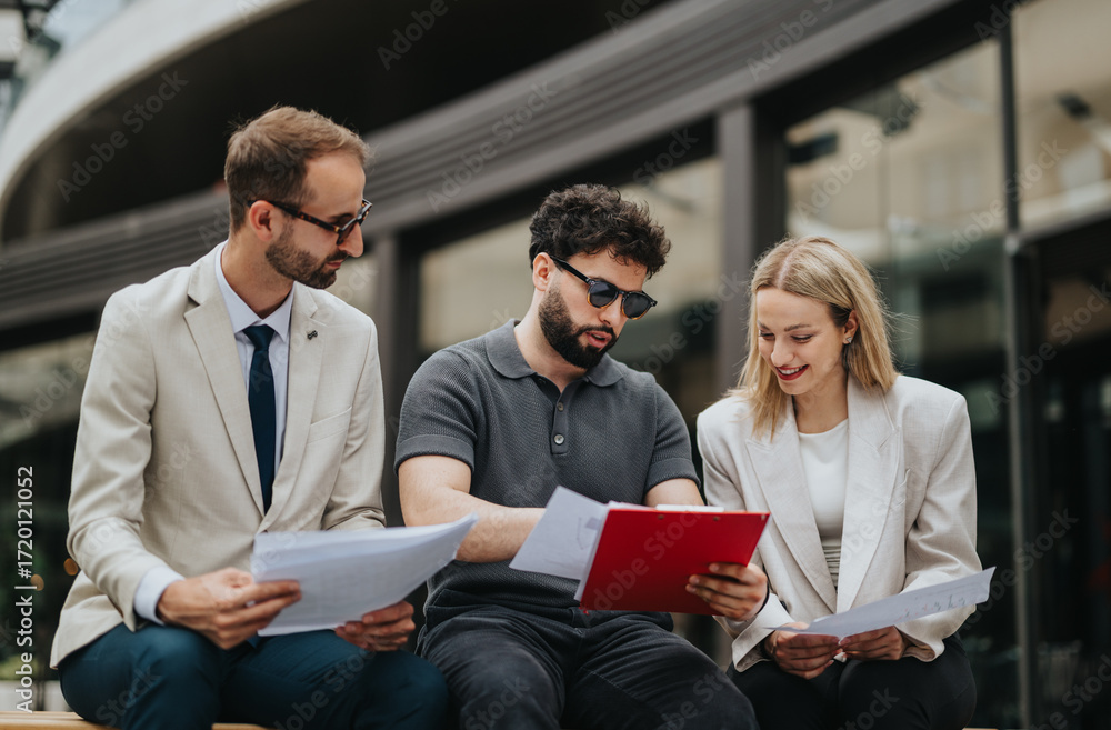 Three professional individuals collaborating and reviewing documents during an outdoor business meeting, showing teamwork and productivity.