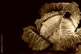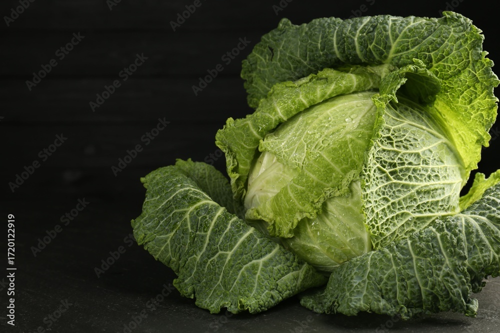 Fresh Savoy cabbage on black table, closeup. Space for text