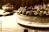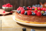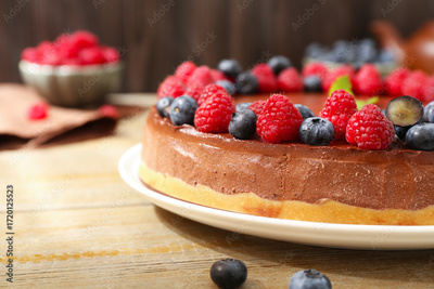 Delicious chocolate cheesecake with berries and mint on wooden table, closeup. Space for text